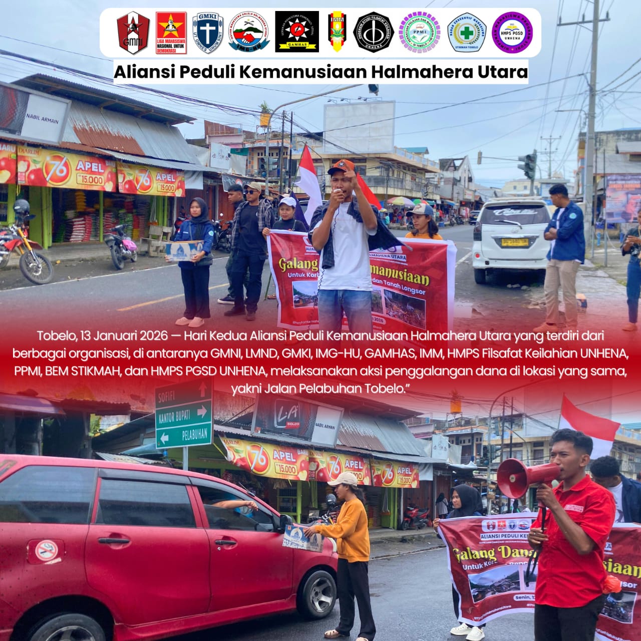 Ketua Aliansi Peduli Kemanusiaan Halmahera Utara, Erik Sibu, yang juga menjabat sebagai Ketua GMNI Halmahera Utara, menyampaikan bahwa aksi penggalangan dana ini bertujuan untuk meringankan beban masyarakat terdampak bencana yang hingga kini masih membutuhkan bantuan nyata.