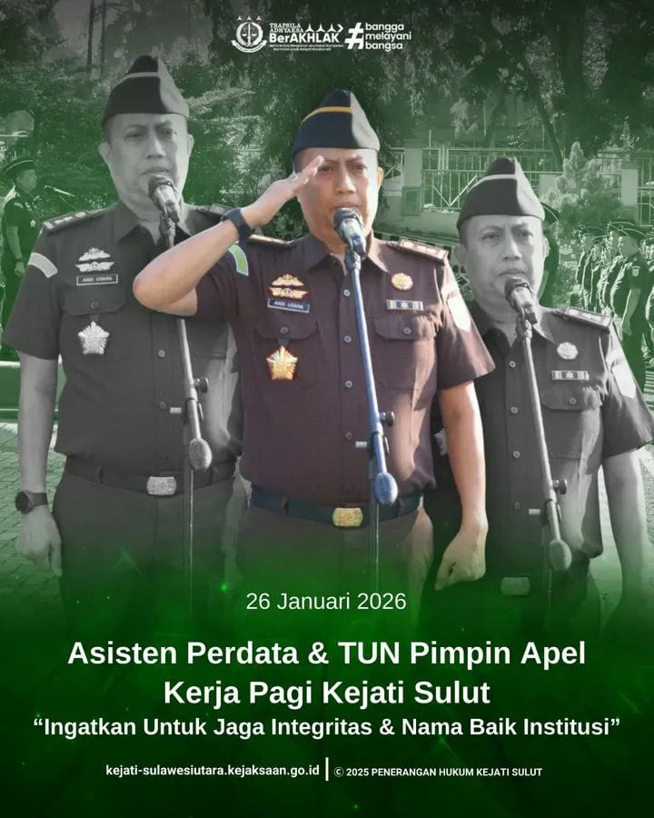 MANADO, Lintaslestari.news – Kejaksaan Tinggi Sulawesi Utara (Kejati Sulut) kembali melaksanakan apel kerja pagi pada Senin, 26 Januari 2026. Apel tersebut digelar di halaman Kantor Kejati Sulut dan diikuti oleh seluruh jajaran pegawai.