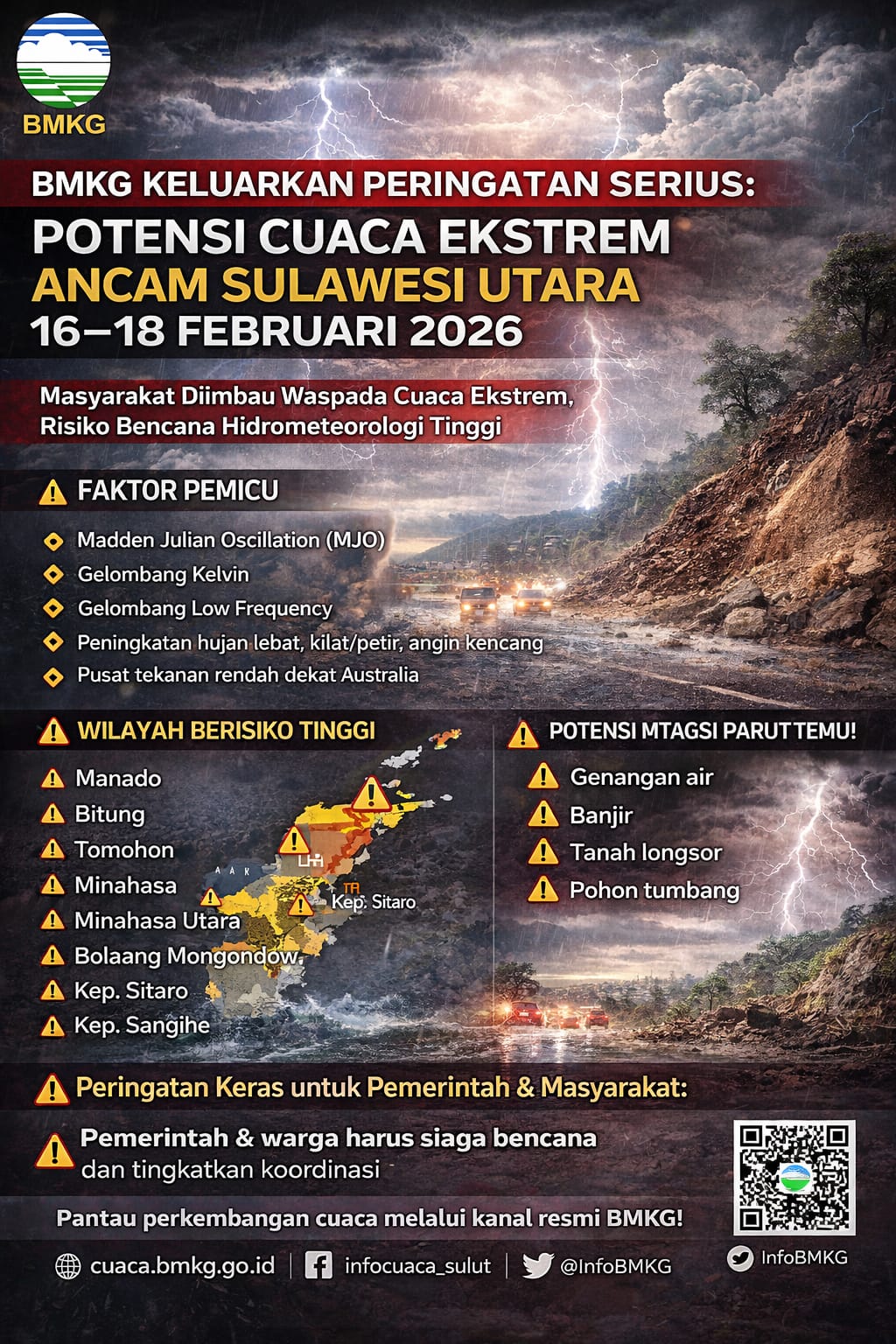 Sumber Resmi: Himbauan Kewaspadaan Cuaca Ekstrem BMKG Stasiun Meteorologi Sam Ratulangi Manado Tanggal: 15 Februari 2026.