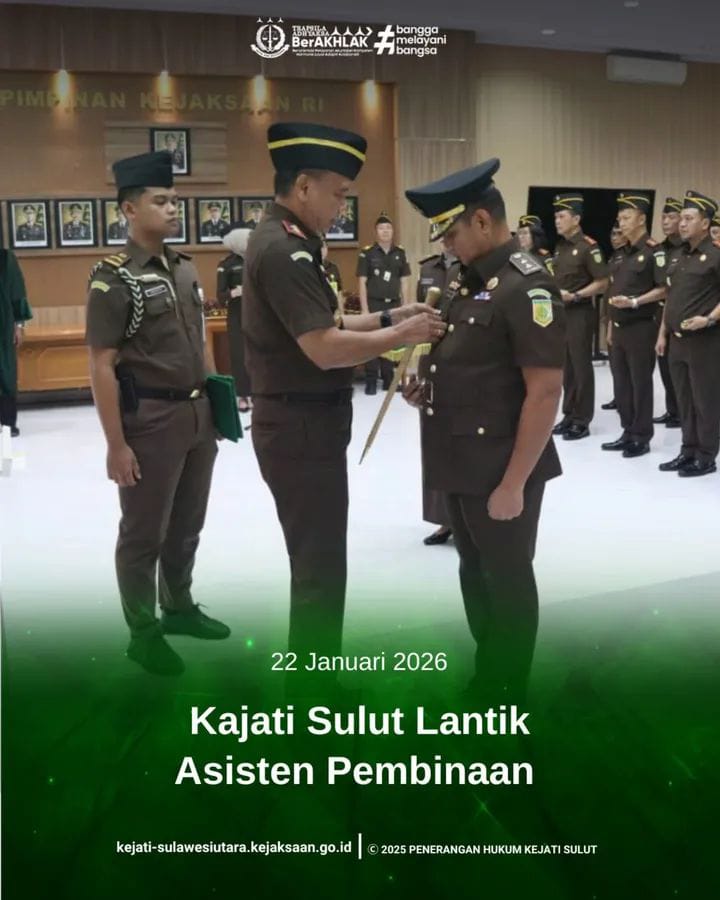 MANADO, Lintaslestari.news — Kepala Kejaksaan Tinggi Sulawesi Utara (Kejati Sulut) Jacob Hendrik Pattipeilohy, S.H., M.H. secara resmi melantik Fahri, S.H., M.H. sebagai Asisten Pembinaan Kejaksaan Tinggi Sulawesi Utara. Pelantikan tersebut merupakan bagian dari mekanisme organisasi Kejaksaan Republik Indonesia dalam rangka penguatan tata kelola internal serta optimalisasi pelaksanaan tugas kelembagaan.