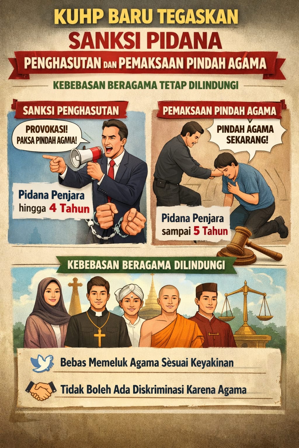 Minahasa utara, Lintaslestari.news — Kitab Undang-Undang Hukum Pidana (KUHP) baru secara tegas mengatur sanksi pidana terhadap perbuatan penghasutan dan pemaksaan seseorang untuk meninggalkan atau berpindah agama.