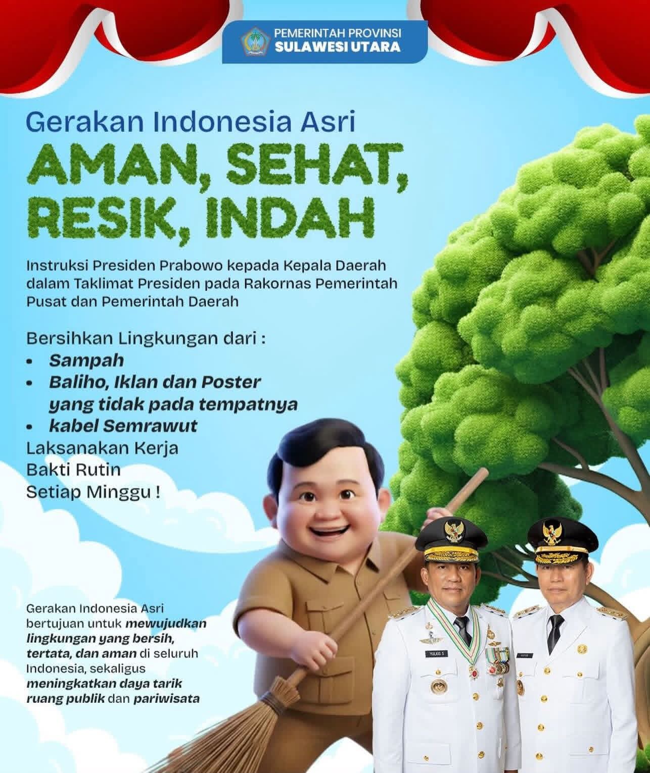 Gerakan Indonesia ASRI merupakan program nasional yang bertujuan menciptakan lingkungan yang bersih, tertata, aman, sehat, dan indah melalui keterlibatan aktif pemerintah daerah serta partisipasi masyarakat secara berkelanjutan. Menindaklanjuti arahan Presiden, Pemerintah Provinsi Sulawesi Utara mendorong seluruh pemerintah kabupaten/kota, perangkat daerah, serta masyarakat untuk melakukan langkah nyata, antara lain: membersihkan lingkungan dari sampah di ruang publik dan pemukiman; menertibkan baliho, spanduk, iklan, dan poster yang tidak sesuai ketentuan dan mengganggu estetika kota; menata kabel jaringan yang semrawut demi keselamatan dan keindahan lingkungan; melaksanakan kerja bakti rutin secara terkoordinasi dan berkelanjutan.
