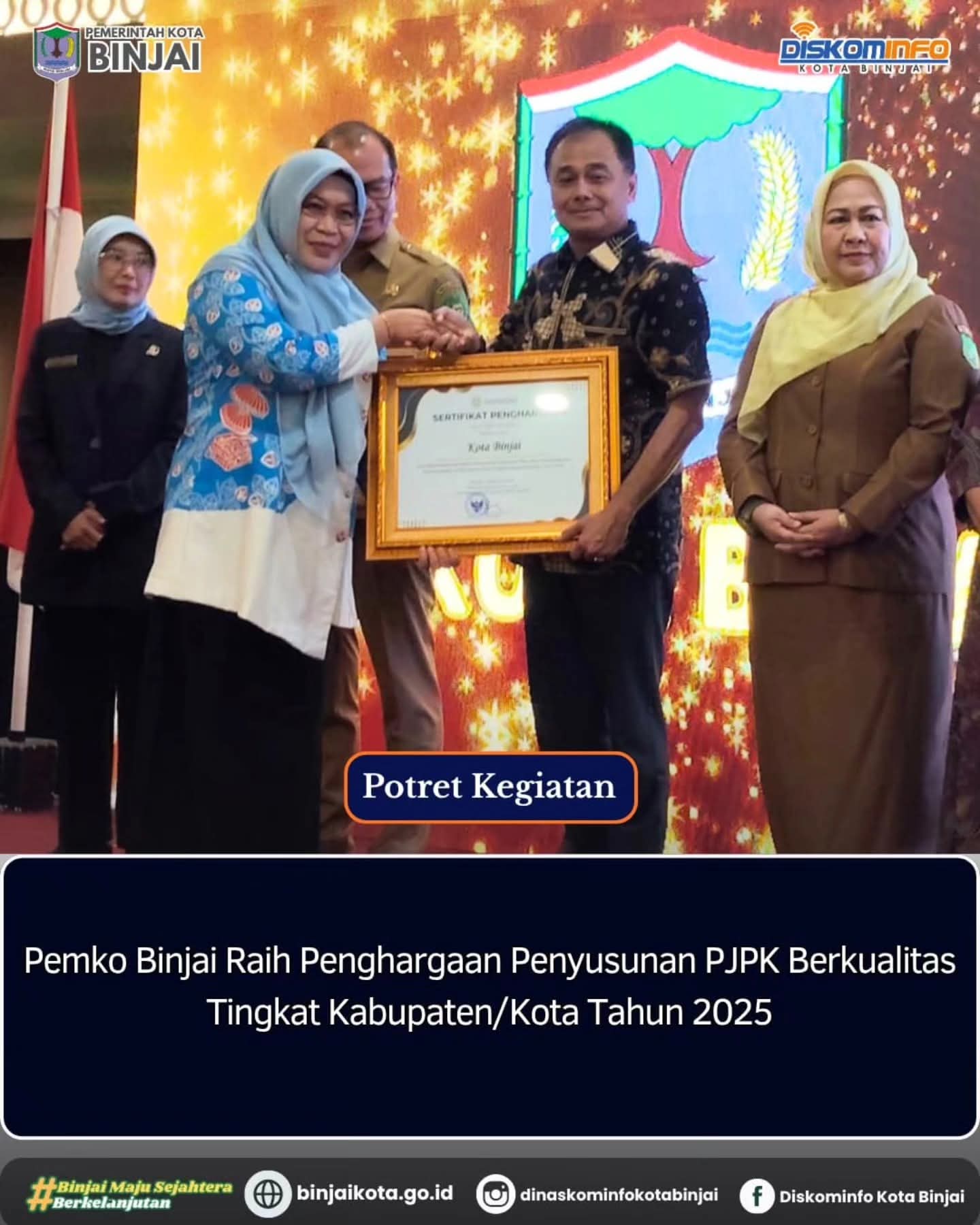 Binjai , (SUMATERA UTARA) Lintaslestari.news – Pemerintah Kota Binjai menerima apresiasi dari Menteri Kependudukan dan Pembangunan Keluarga/BKKBN atas keberhasilan dalam penyusunan Dokumen Peta Jalan Pembangunan Kependudukan (PJPK) berkualitas tingkat kabupaten/kota tahun 2025.