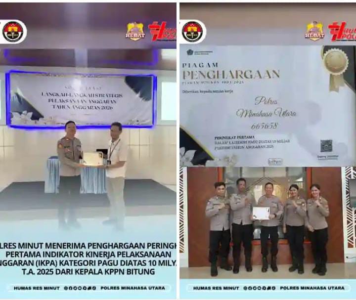 > “Polres Minut menerima penghargaan peringkat pertama Indikator Kinerja Pelaksanaan Anggaran (IKPA) kategori pagu di atas 10 miliar T.A. 2025 dari Kepala KPPN Bitung di ruang Tarsius KPPN Bitung. (05/02/2026).”