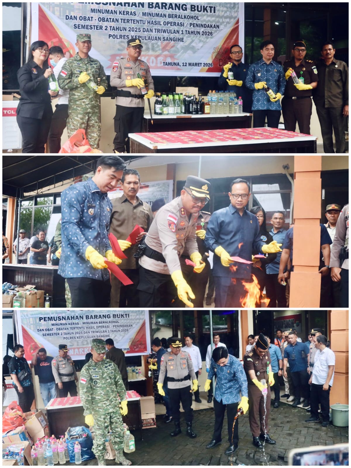 Pemusnahan barang bukti ini dihadiri oleh Bupati Kepulauan Sangihe Michael Thungari, Kapolres Kepulauan Sangihe AKBP Abdul Kholik, Dandim 1301 Tahuna Letkol Czi Nazarudin, serta unsur Forkopimda dan perwakilan instansi terkait lainnya.