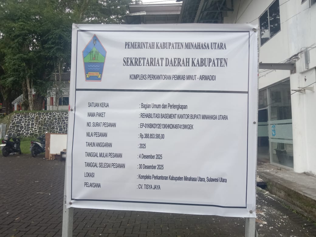 Minahasa Utara, Lintaslestari.news — Pelaksanaan proyek Rehabilitasi Basement Kantor Bupati Minahasa Utara dengan nilai Rp388.853.595,00 pada Tahun Anggaran 2025 kini memasuki tahap perhatian dan monitoring publik. Proyek yang berada di Kompleks Perkantoran Pemkab Minut, Airmadidi tersebut dinilai perlu dikawal secara berkelanjutan guna memastikan penggunaan anggaran daerah berjalan sesuai prinsip akuntabilitas.