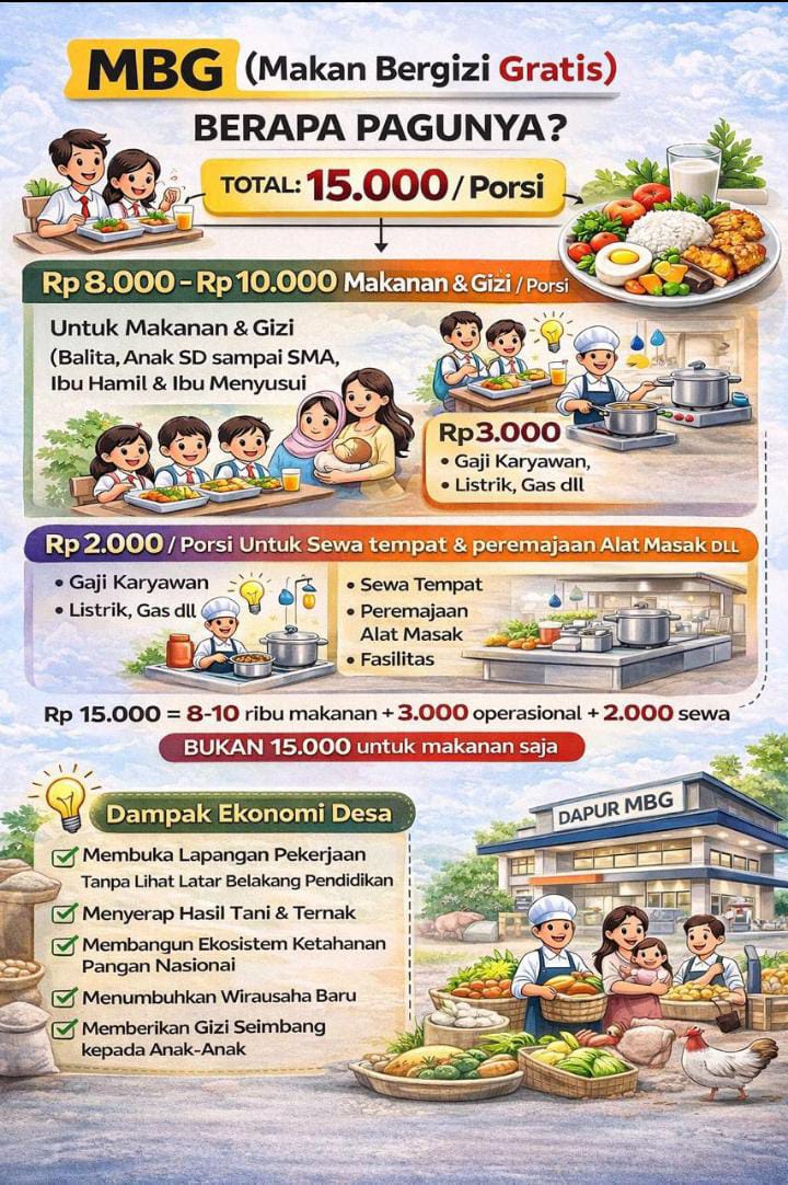 Dalam sosialisasi tersebut dijelaskan bahwa total anggaran untuk setiap porsi makanan dalam program MBG sebesar Rp15.000. Anggaran ini tidak hanya diperuntukkan bagi pembelian bahan makanan, tetapi juga mencakup biaya operasional dan pendukung yang menjadi bagian penting dalam penyelenggaraan layanan gizi yang berkelanjutan.